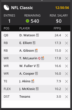 Watson, Cooks, and Fuller, are all excellent strong plays that can go nuts here. Watson is playing at an elite level right now. Jordan Akins is a good streamer at TE and Keke Coutee is cheap DFS option and decent play with Randall Cobb and Kenny Stills both OUT for this game. Perhaps Darren Fells is a decent DFS play if the Texans decide to use two TE sets more often. Despite the juicy matchup, I still don’t trust Duke Johnson, he’s not getting many holes to run through and they don’t throw to him enough in the passing game. Maybe Prosise mixes in more this week. The Texans will get their LT tackle Laremy Tunsil back, which is big.